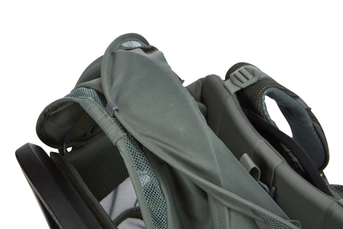 - W przypadku dłuższych wędrówek, które wymagają dodatkowego miejsca do przechowywania lub ochrony przed warunkami atmosferycznymi, można użyć plecaka THULE Sapling Sling Pack lub osłony przeciwdeszczowej (każdy produkt sprzedawany osobno)