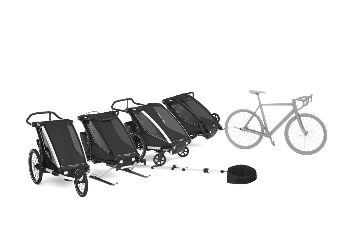 4 opcje aktywności — jazda na rowerze, jogging, spacerowanie i jazda na nartach (zestawy do joggingu i nart są sprzedawane oddzielnie). W zestawie osłona przeciwdeszczowa i daszek.