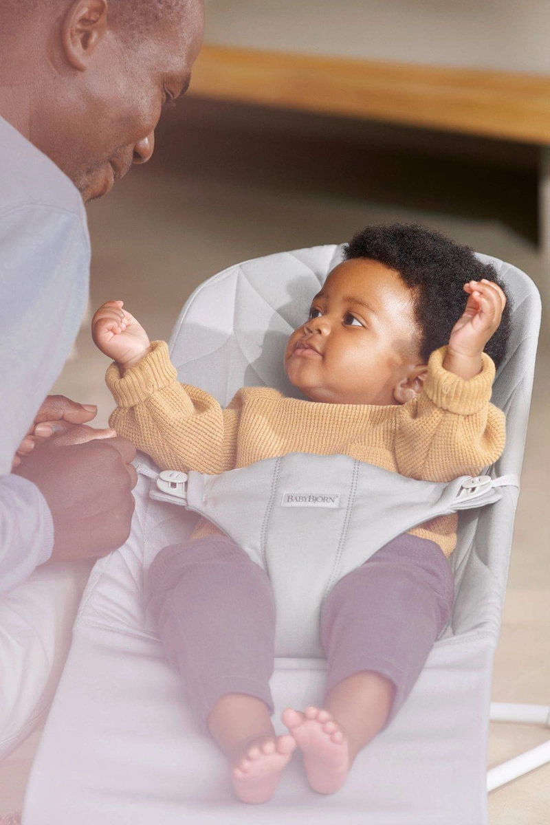 Leżaczek BabyBjorn zapewnia Twojemu dziecku przytulne miejsce do zabawy i odpoczynku. Porusza się dzięki naturalnym i spontanicznym ruchom dziecka. Dziecko bujając się rozwija zdolności motoryczne oraz równowagę w całkowicie naturalny dla siebie sposób. Młodsze dziecko można delikatnie i cicho kołysać ręką lub stopą.