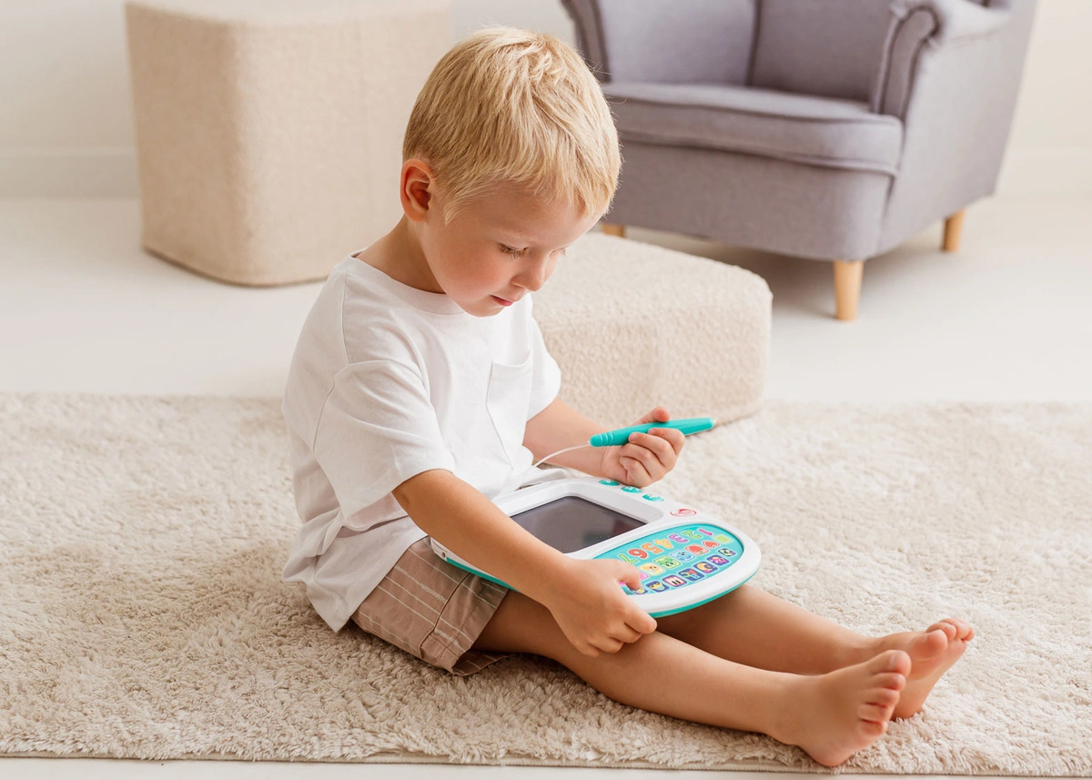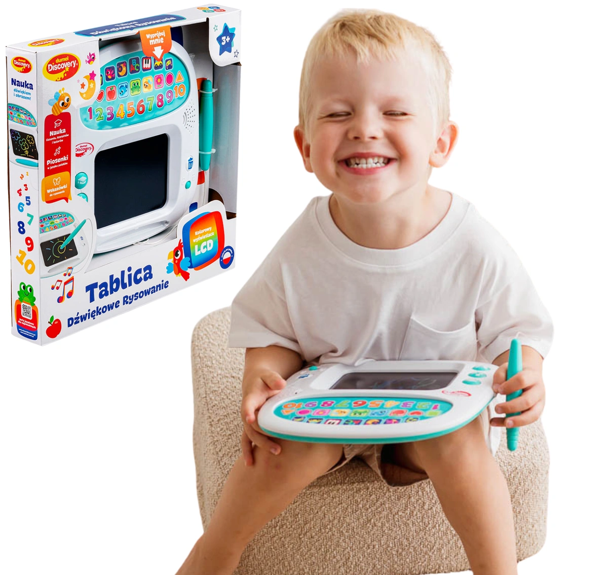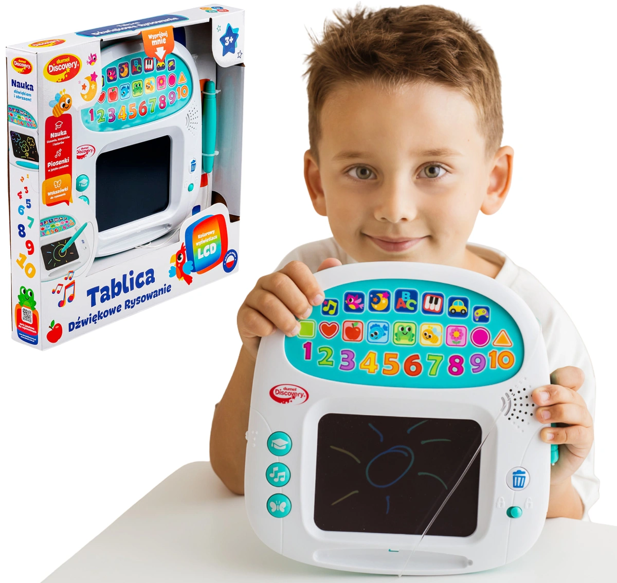 • Ta edukacyjna tablica bawi, edukuje, a nawet inspiruje artystycznie! Zabawkę tworzy panel dźwiękowy, wyposażony w kolorowe przyciski z obrazkami, oraz tablica do rysowania. Kolorowe obrazki uczą liczenia, kolorów, kształtów, a także bawią grą w zgadywanie. Znajdziemy tu także wesołe melodie i zabawne dźwięki. Obok tablicy, stanowiącej przestrzeń do artystycznych improwizacji dziecka, znajdują się trzy dodatkowe przyciski, które aktywują wskazówki do rysowania oraz piosenki w języku polskim. Tablica wyposażona została w niezwykle przydatną funkcję blokady zmazywania, co pozwala zapobiec przypadkowemu usunięciu obrazka, narysowanego za pomocą dołączonego rysika.