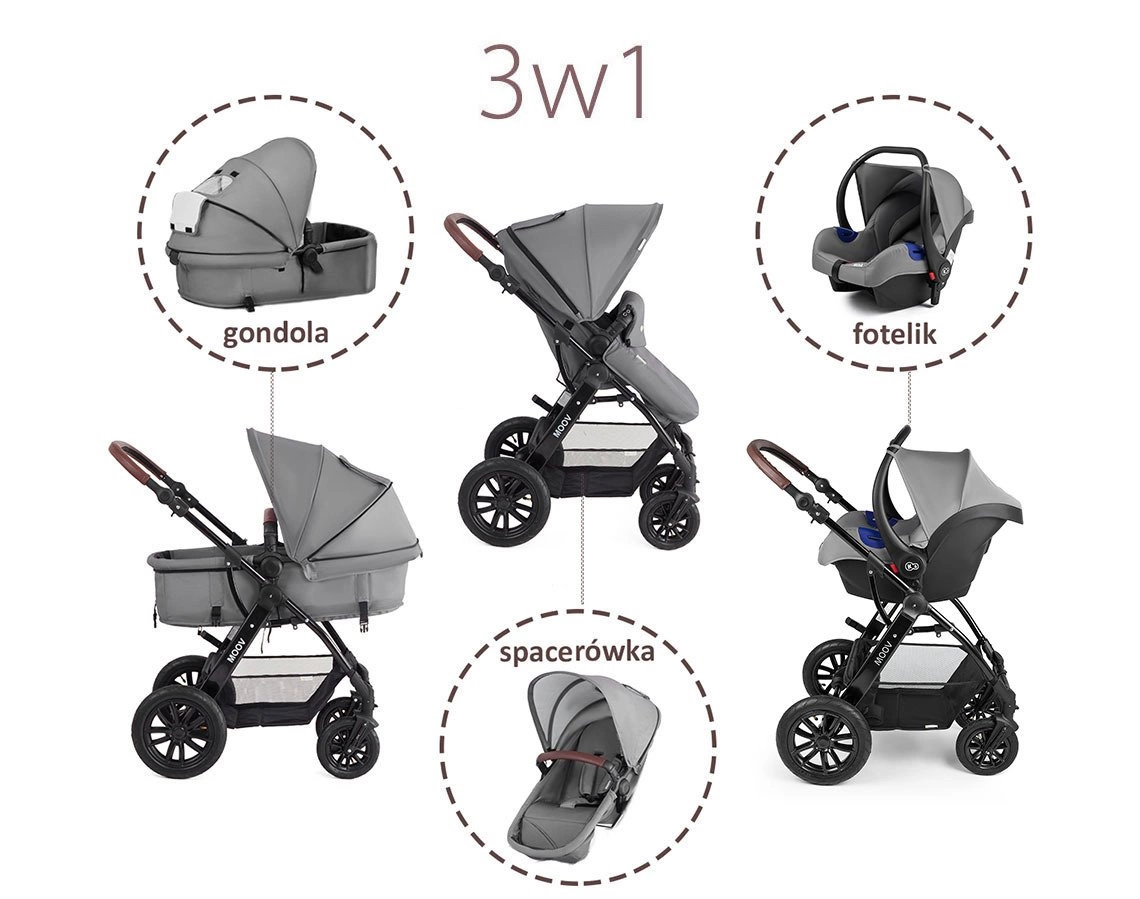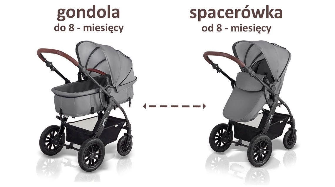 to innowacyjny, starannie zaprojektowany i ergonomiczny wózek głęboko-spacerowy. Uniwersalna propozycja, który spełnia trzy podstawowe funkcje: gondoli, spacerówki oraz fotelika samochodowego. MOOV łączy w sobie nie tylko funkcjonalność, ale i nowoczesny design. Jest zwrotny, wygodny i dostosowany do zróżnicowanych warunków pogodowych. Wygodne użytkowanie zapewnia 3-punktowa regulacja wysokość rączki, bardzo prosty mechanizm składania oraz skrętne, pompowane koła, dzięki czemu doskonale nadaje się na spacery w lesie, jak i warunkach miejskich. Wykonany z lekkich i mocnych materiałów stelaż o wadze 8 kg jest wyposażony w cztery amortyzowane koła oraz wygodny centralny hamulec.