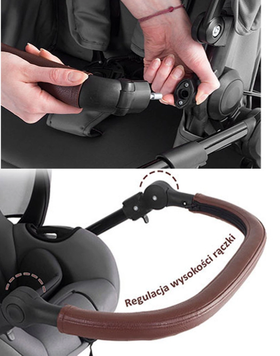 Elegancka rączka zapewnia wysoki komfort prowadzenia wózka o każdej porze roku. Rączka jest regulowana, można ją opuszczać lub podnosić, dzięki czemu prowadzenie wózka będzie tak samo wygodne dla osób wysokich, jak i średniego wzrostu.