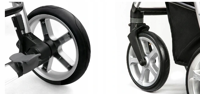 • Przednie koła są skrętne, z osią obrotu 360 i dodatkową blokadą, która przydaje się na wyjątkowo nierównej nawierzchni. Przednie koła również posiadają amortyzację, która minimalizuje wstrząsy przy zetknięciu z krawężnikami.