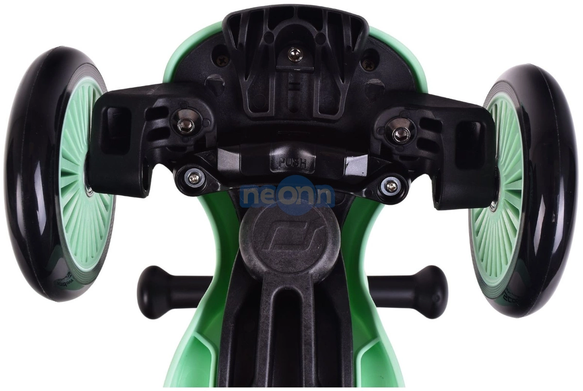 Bez używania narzędzi, za pomocą jednego guzika można w kilka sekund zamienić pojazd w hulajnogę na 3 kołach – obrócone siedzisko staje się jej przednią ramą. Wystarczy jeszcze przenieść kierownicę (montowana na klik) i gotowe! Teraz także starszak może rozpocząć swoją skejterską przygodę.