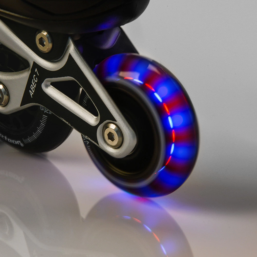 Rolki wyposażone zostały w dwa kółka LED, które świecą poprzez wprowadzenie ich w ruch.