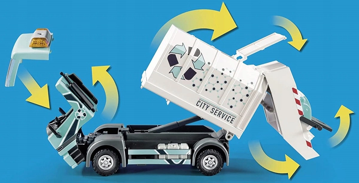 Tylną część śmieciarki do recyklingu można odchylić do tyłu i rozładować. Czystość jest ważna, zespół sprzątający Playmobil zapewnia to przy pomocy dużej śmieciarki.